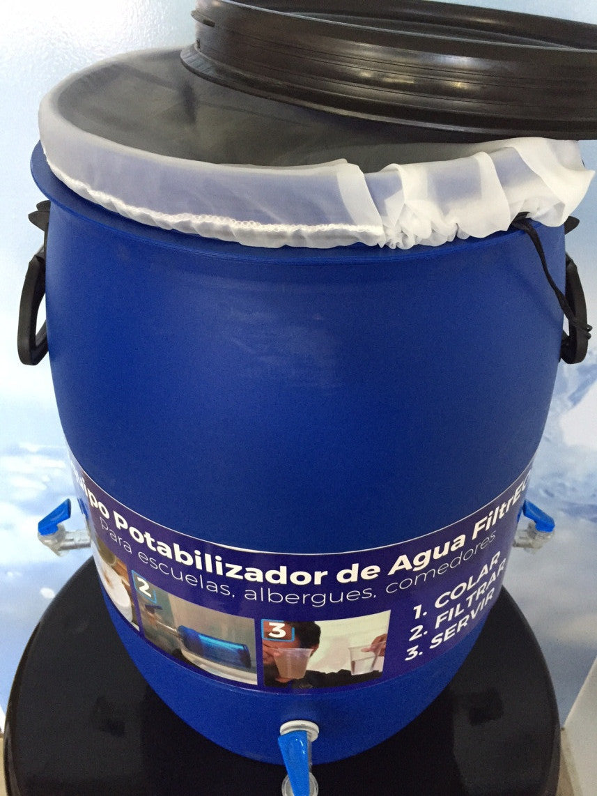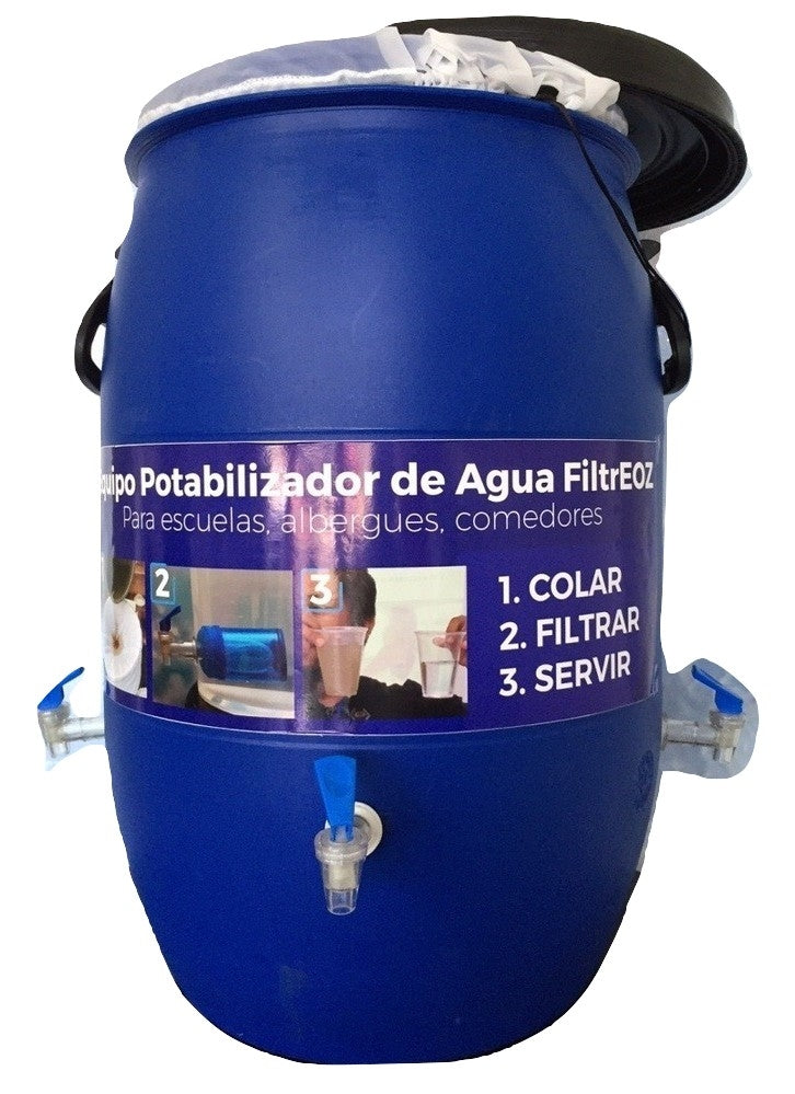 Incluye tambo de 60 litros y 3 cartuchos de microfiltración con 3 llaves de suministro para facilitar el uso por grandes cantidades de alumnos o personas en escuelas y comedores. Vida útil 100,000 litros o 2 a 3 años de uso con retrolavado mensual de los filtros por medio de la jeringa de 50 mL incluida en el kit.